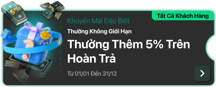 - Thưởng thêm 5% trên hoàn trả không giới hạn.